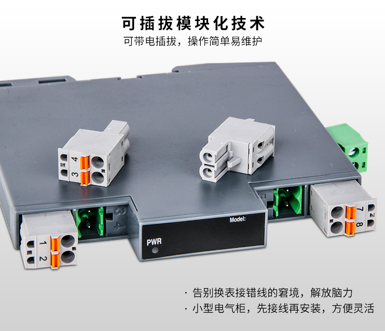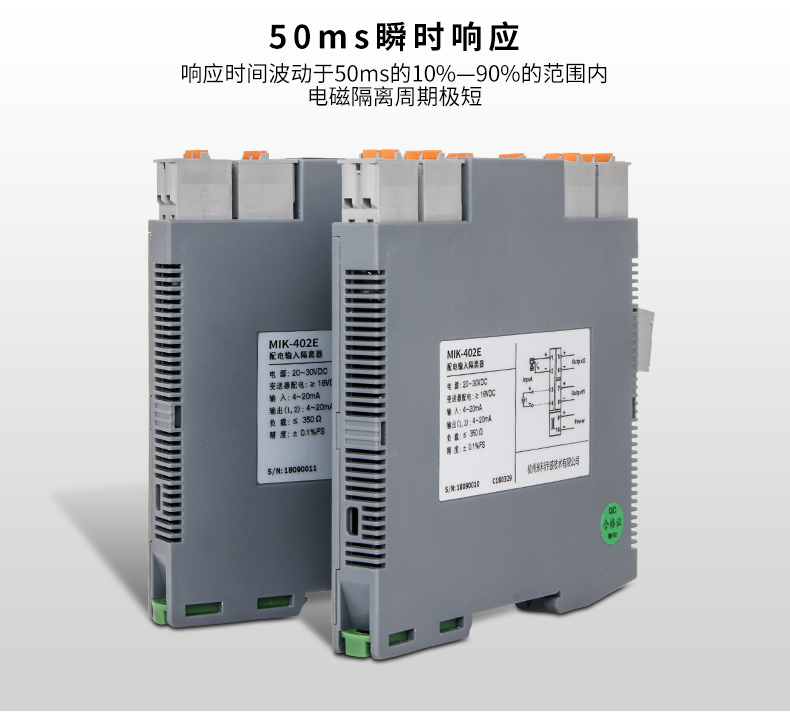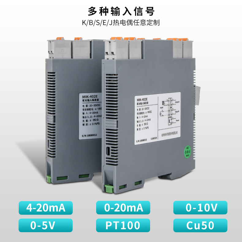 MIK-402E系列信號隔離器,電壓、電流隔離器將直流電壓或電流信號經過隔離傳送,轉換成所需的信號給其他儀表??梢耘c單元組合儀表及DCS、PLC等系統配套使用,給予現場儀表信號隔離、信號轉換、信號分配、信號處理等,從而提高工業生產過程自動控制系統的抗干擾性能力,保證系統的穩定性與可靠性。本產品品種分為一進一出、一進二出、一進三出、一進四出、二進二出,且輸入、輸出、電源三端隔離。并且大量運用于配電柜和隔離箱等各種工業場合。