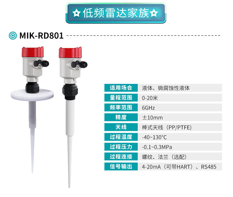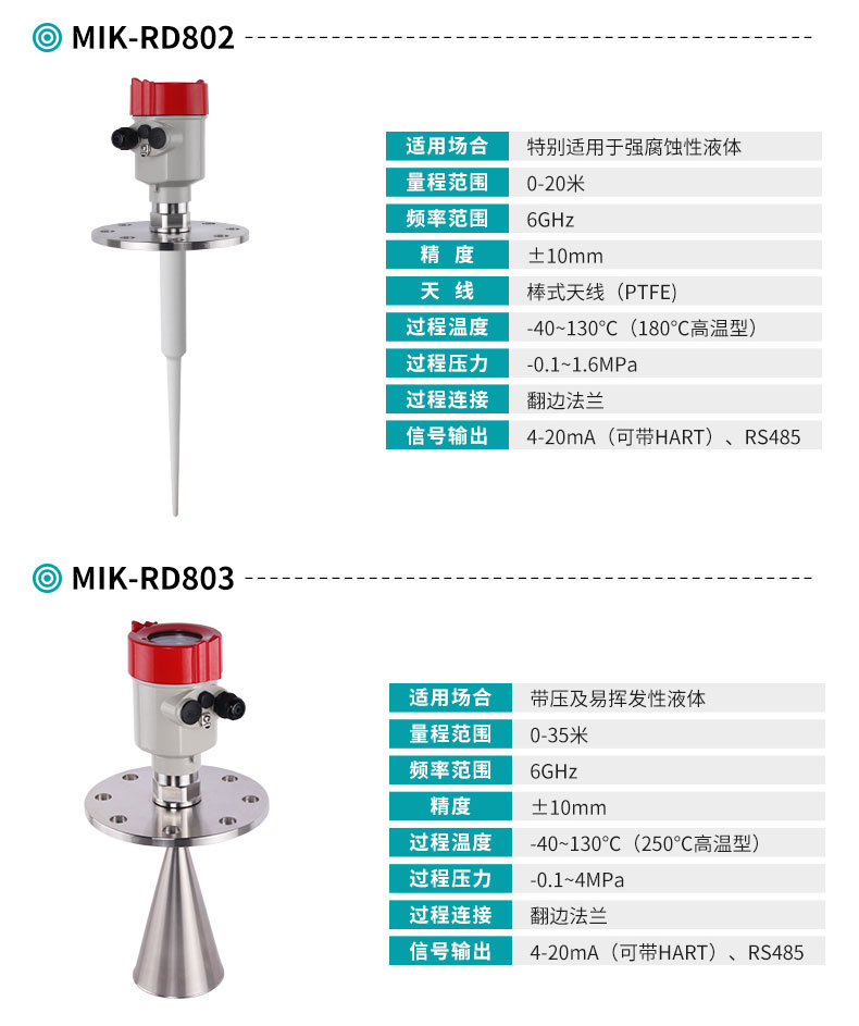 適用場合:米科MIK-RD80系列低頻雷達液位計,新型快速的微處理器可以進行更高速率的信號分析處理,使得儀表可以用于水液儲罐、酸堿儲罐、漿料儲罐、固體顆粒、小型儲油罐,以及各類導電、非導電介質、腐蝕性介質,還有如煤倉、灰倉、油罐、酸罐等一些復雜的測量工況。