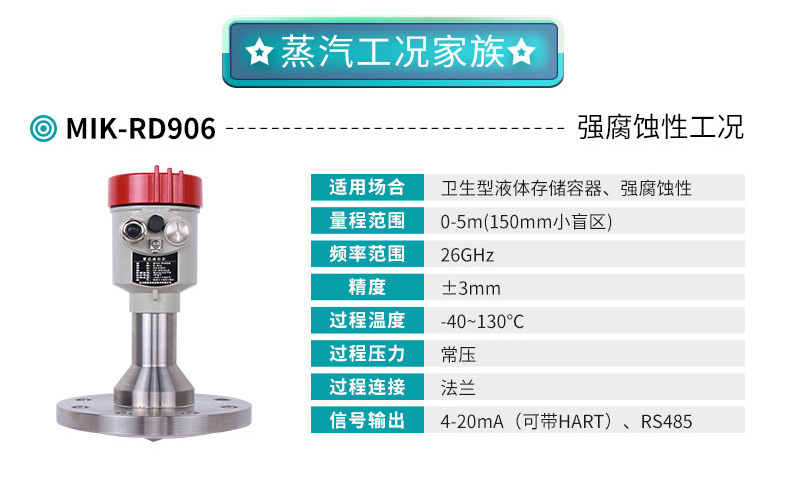 適用場合:MIK-RD908/909智能高頻雷達水位計,新型快速的微處理器可以進行更高速率的信號分析處理,使得儀表可以用于水液儲罐、酸堿儲罐、漿料儲罐、固體顆粒、小型儲油罐,以及各類導電、非導電介質、腐蝕性介質,還有如煤倉、灰倉、油罐、酸罐等一些復雜的測量工況。