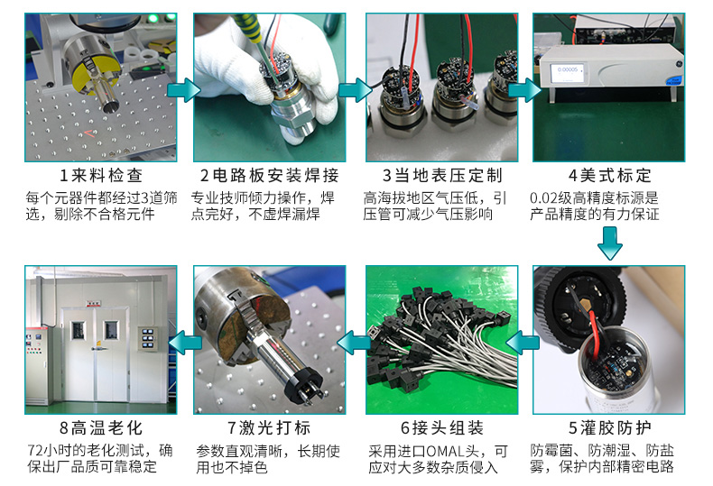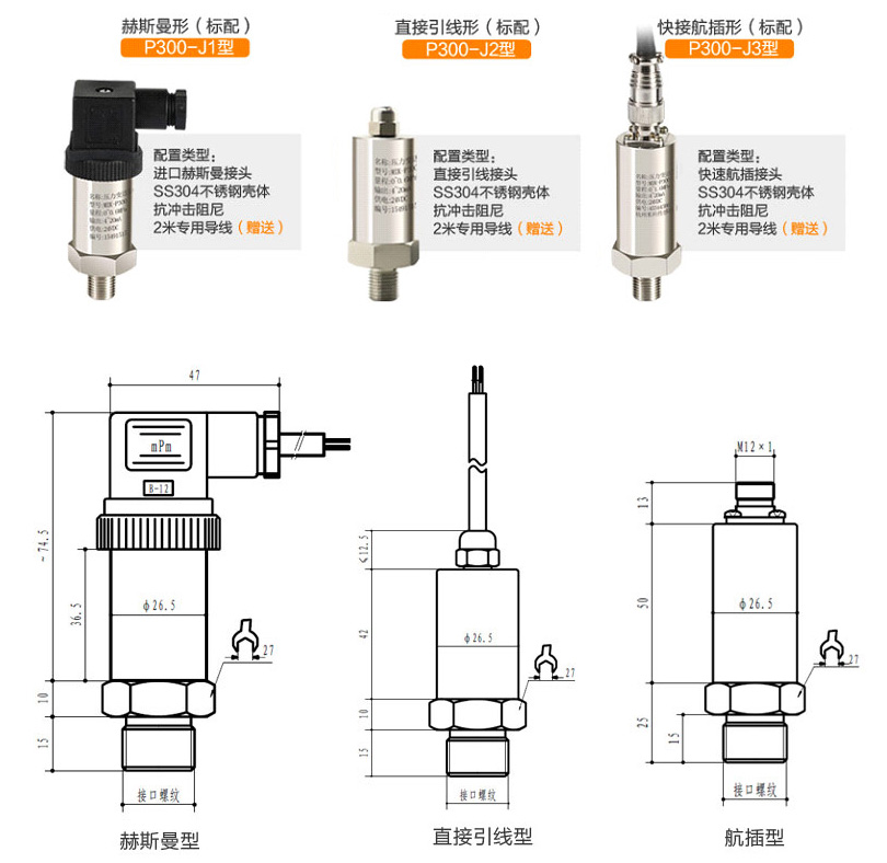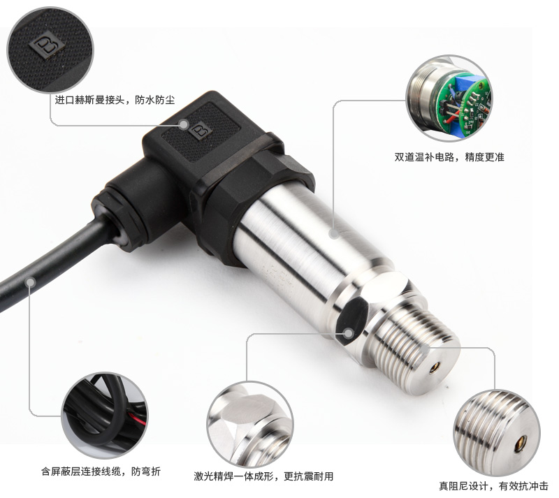 外形結構多樣化 激光打印標簽 抗干擾強、長期穩定性好 采用316L不銹鋼隔離膜片結構、其抗腐蝕能力大大優于304不銹鋼 微型放大器,電壓、電流信號輸出 高精度、全不銹鋼結構,經過多次不銹鋼焊接,實現了全固態設計,在惡劣的環境中可以長期使用 高品質接線端子,抗干擾強,長期穩定性好 歐洲進口赫斯曼接頭,讓信號一直穩定 10年工藝考驗,電路設計不斷優化,抗干擾性能極強 五年設計壽命,使用時間更久 進口擴散硅芯體,測量更準確