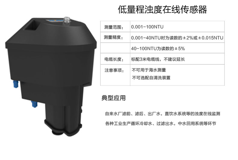 適用場合:濁度在線分析儀具有超低濁度檢出限、高精度測量、設備長時間免維護、省水工作和數字化輸出的特點,可廣泛應用于自來水出廠水、二次供水、管網末梢水、直飲水、膜過濾水、游泳池、地表水等濁度在線監測。
